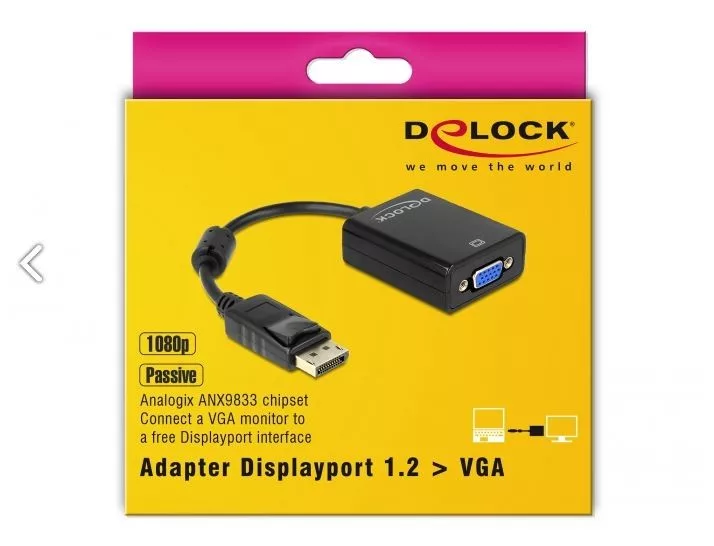 Ez a Delock adapter lehetővé teszi, hogy például egy VGA-monitort csatlakoztassunk egy szabad Displayport-csatolón keresztül.