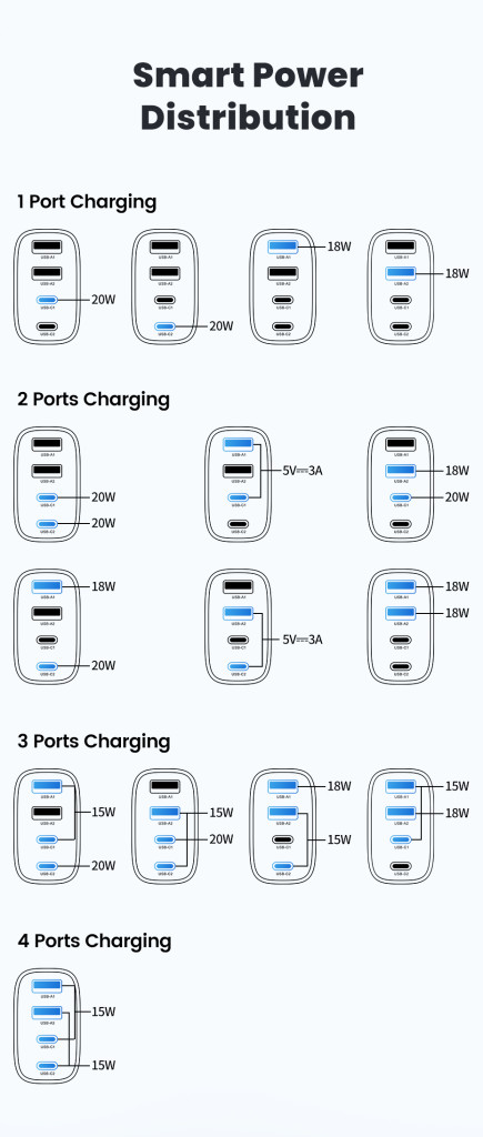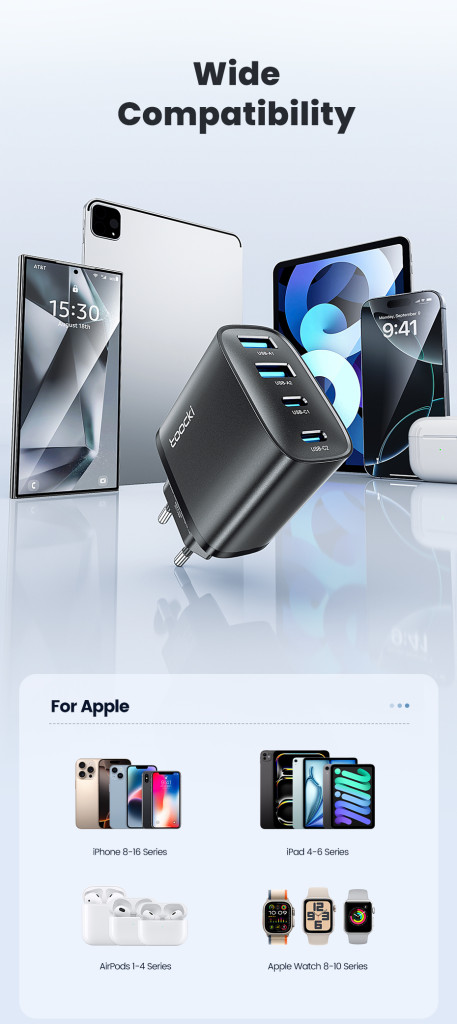Ez a 4 portos Toocki szuper gyors töltő akár utazó adapterként is használható. Akár 4 eszköz is tölthető egyszerre az adapterrel.