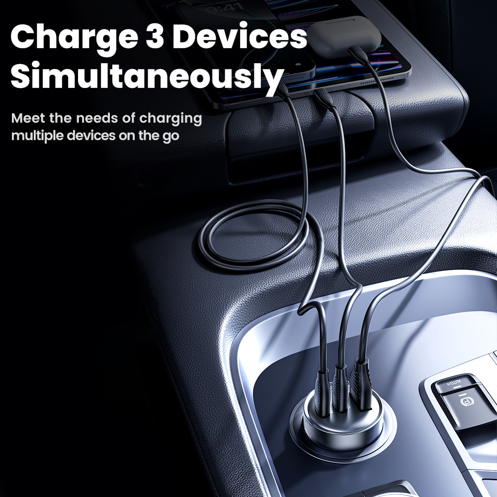 Biztonságos és praktikus autós gyors töltő adapter. 1 db USB A és 2 db USB C porttal rendelkezik, melyek segítségével egyszerre akár három eszközt is tölthet.